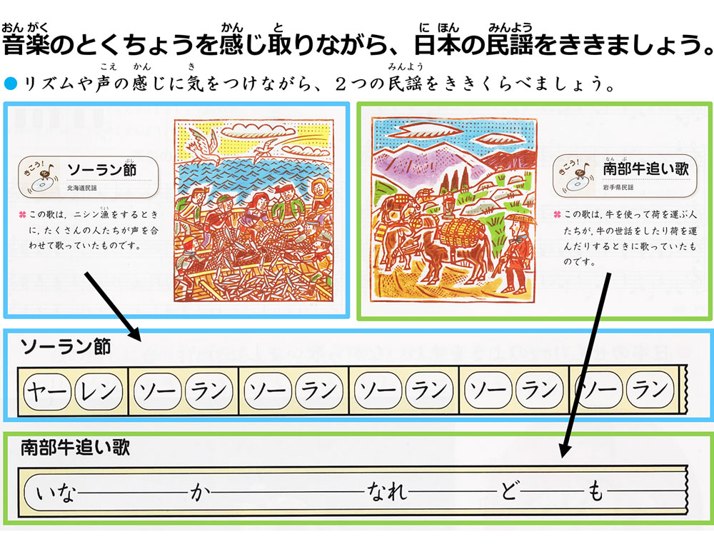 Used for introducing Japanese traditional songs and comparing the difference between two songs.